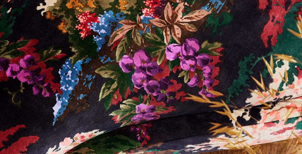 Mjuk sammet blir ännu mjukare med en frans på kudden. Romantiskt mönster i pudriga toner Omega Print. Tyger från Linwood.