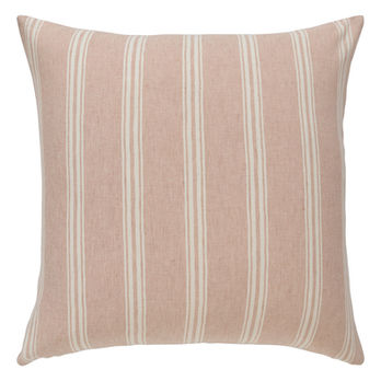 inred med kuddar i mjuka färger och varierande storlekar.